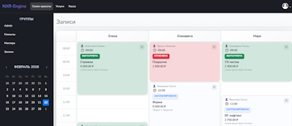 Модуль «Салон красоты» для NXR-Engine: календарь записей по мастерам, клиенты, услуги, статусы. Настройка в билдере, перенос перетаскиванием. Инструкция по настройке и использованию.