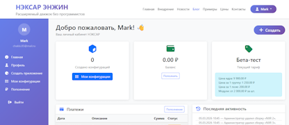 Это состояние, в котором пользователь только зарегистрировался: конфигураций еще нет, но доступна вся структура кабинета, чтобы сразу понять, куда идти и с чего начинать.