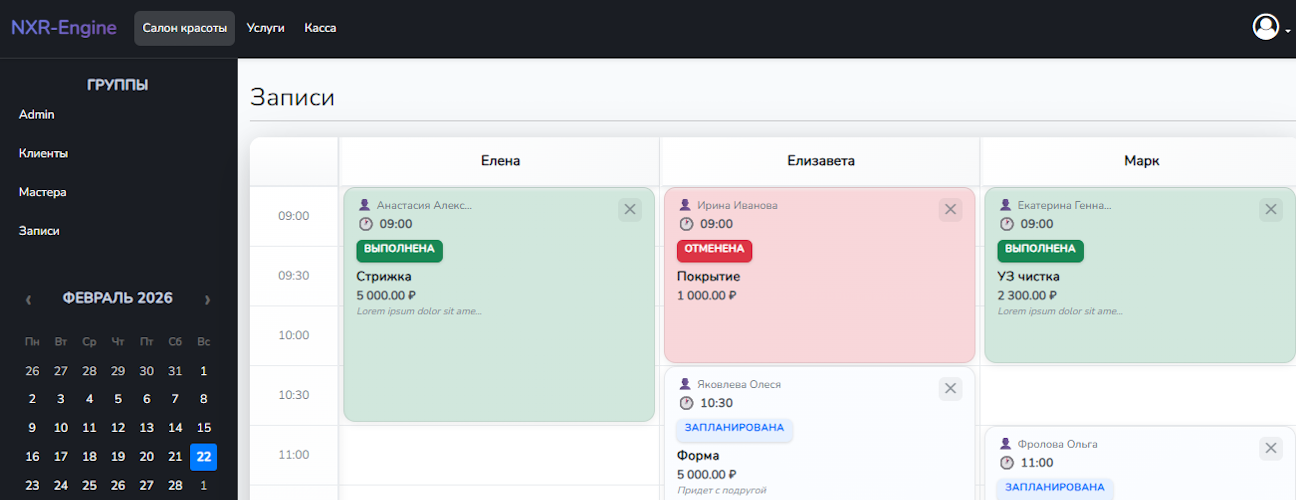 - Переносить запись на другое время или к другому мастеру перетаскиванием